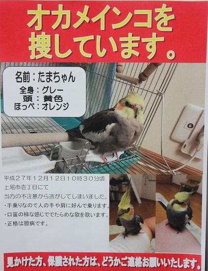 先ほど・・・ スコちゃんのお家が決まりました! K様、有難うございます! 今後もどうぞヨロシクお願いいたします (^^)/ ではまた (おし・ω・らせ) 12月12日、10時半頃 上尾市壱丁目にて逃げられてしまったとの事です 名前「たま」ちゃん ノーマルカラーのオカメインコ(♂)です 見かけた方、保護された方は どうか当店までご連絡お願いいたします! ☆☆☆☆メルマガのご案内☆☆☆☆ 当店だけのメールマガジン始めました!(^^) 詳しくはこちらをクリック→★★ |