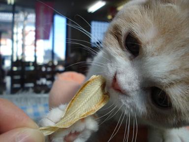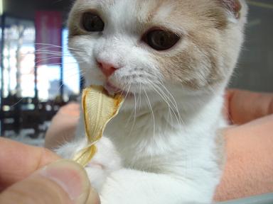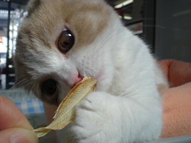 こんにちはー いずみんです 今日も昨日に引き続きスコ君の登場です とてもおっとりとしていて性格◎の子なので・・・ 今日はおやつをあげちゃいます! じゃじゃ~ん! 最近取り扱いを始めた「舌ひらめ」をあげてみます 気になる反応は・・・? まず正面からニオイを嗅いでいます・・・。 続いて左から・・・ そして右から・・・ 鼻に押し付けて― また正面かいっ!! しかし次の瞬間!! はぐっ!ときました! なかなか離してくれませ~ん どうやら気に入って頂けたようです